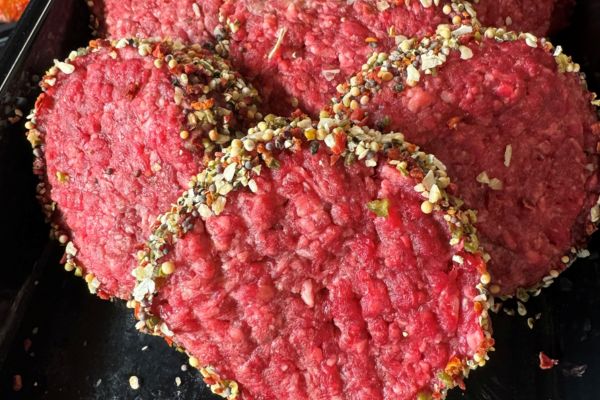 Hakkebøf m. krydderi kanten rundt, vejer ca. 125 g.