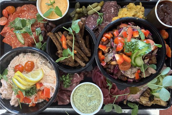 - 2 slags af slagter Madsen’s krydderspegepølser med bl.a. pickles, oliven, chili mayo samt syltet rødløg