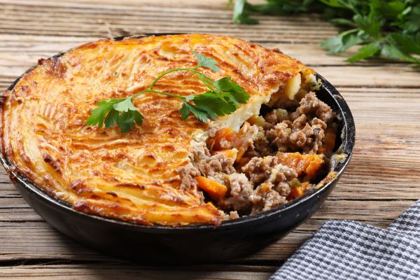 Lækker Oksekøds blanding med kartoffelmos og ost på toppen.
